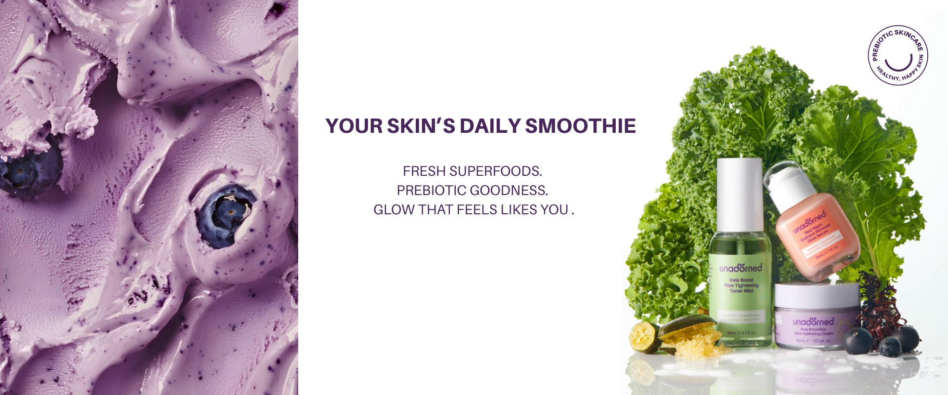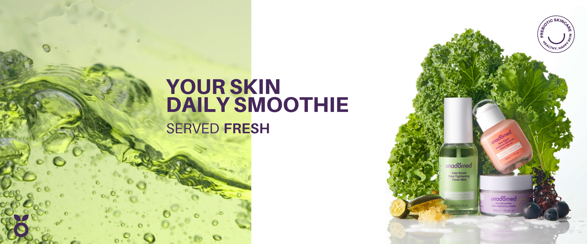 Discover the colour-charged superfoods behind your skin’s natural radiance. From kale green to acai purple, each Unadorned formula blends four vibrant botanicals — Kale, Finger Lime, Red Algae, and Acai— to boost balance, hydration, and glow.